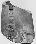 | Description: | Broken top and bottom, and much damaged by burning; the glaze much peeled. Two panels, separated by vertical stripes, one beneath each ear, of maeander alternating with saltire cross. A) Draped female figure, left, preserved shoulders to waist, carrying a scarf. Above her in the field the letters: <graphic> B) A girl, right, preserved head to waist, wearing chiton, himation and kerchief. A writing tablet(?) carried by a string, in her outstretched right hand. b) Much of the lower part found in tins, mended from several pieces. The lower parts of both figures remain, with most of the wool basket belonging to A. Lower border, maeander broken by cross-squares; then reserved and glazed bands alternating. Round bottom glazed black. All much burned and worn. | |