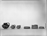 | Description: | Circular pyxis with pseudo-base; mended from several pieces. The straight side wall is set back a little from the edge of the base creating ledge to receive the lid. Interior and outer edge of ledge, glazed dull black to brown. Meant to have a lid as deep as the side wall, fitting over it and resting on ledge. | |