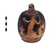 | Description: | Squat lekythos. Heavy rounded body with ring foot, one handle and a narrow neck; the handle and lip missing; a small hole broken in the back. On the body, opposite handle, and on an egg-pattern band for ground, a draped woman, left. With her right hand she pours from a bowl an offering onto the altar which she faces. With her left she grasps a thyrsos. A round object suspended in the air over the altar. At the base of the neck, a band occupying rather more than half the circumference is reserved and decorated, below two bands, with elongated petals; dots between their tips. No contours. By the same hand, P 5264 and P 5265. Cf. National Museum, Athens. N.M. 1207, N.M. 1280, both squat lekythoi. | |