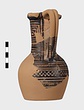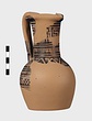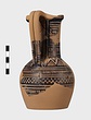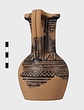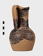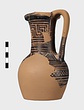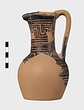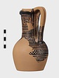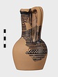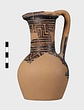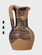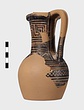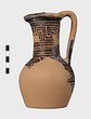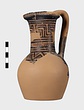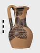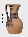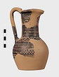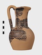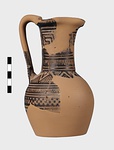 | Description: | The base and most of the body are missing; restored in plaster. Rounded body, straight neck with trefoil mouth and vertical double loop handle. On lip, parrallel vertical strokes; on neck, from top: two lines, hatched maeander running left, two lines, zigzag, two lines. On shoulder: reserved zigzag between cross-hatched triangles above and below. On body: zigzags and lines above and below band of checkerboard pattern at point of greatest circumference. Ladder pattern on handle. Grayish clay, dull black glaze. | |