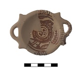 | Description: | Mended from four pieces. Shallow saucer with horizontal loop handles, ends out-turned at rim, one partly preserved. A stand is broken away. Outside, lines; strokes below rim. Inside, on rim, parallel strokes between bands; within, the figure of a warrior running right. His long plumed helmet trails down behind. His great round shield, which covers most of his body, is decorated with bands, hatching and a central swastika. Uncertain object in front of his nose. Gray buff clay; dull red glaze. | |
