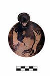Description:   Handle missing. Very shallow askos with low ring base. Flat bottom, projecting slightly, reserved. On top, inside a reserved ring, one on each side of handle and spout, a fat hare and a hound, both running right, the latter chasing the former. Thin glaze strokes for hair. No contours.