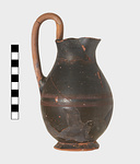 Description:   Mended from many pieces; the base complete; large portions of body, trefoil lip and handle restored in plaster. Heavy flaring foot reserved underneath; double handle reserved.