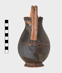 Metallic black glaze outside and inside on lip. Red bands: two around point of greatest circumference and a wavy one around the neck.
