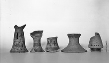 | Description: | Concave wall, spreading base, the inside above hollow for a preserved depth of about 0.047 m. decorated outside with a broad zone of petals and linked oval dots; above and below bands of glaze, the second below with added red. | |