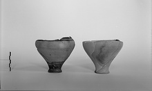 | Description: | Two contiguous fragments, preserving the small projecting vase and part of the body of a vase similar in shape to P 4646. Fine buff clay; creamy slip. Around the bottom and the base, a broad band of thin orange-red glaze. On the shoulder two bands, red to black, and slanting lines above them. | |