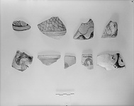 | Description: | Piece from shoulder of small pot similar in shape to P 4646; one handle attachment preserved. Creamy slip with decoration of black lines. Buff clay. | |