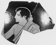 | Description: | Head and part of the shoulder of a draped youth left, his right shoulder uncovered, and right arm extended. Around his head a wreath, carefully drawn in an added color, now lost. Relief contour, for profile. Careful work. Additional fragments from tins: a)Rim piece with boy's head and shoulders. b) Base, with lower part of walls, including, above rays, trunk of tree and tip of staff(?) c) Wall fragment with branches of tree and leaves. d) Wall fragment with bit of branch of tree. e) Plain wall fragment. f) Plain rim fragment. g) Fragment from wall with top of band of rays. | |