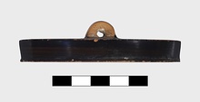 | Description: | Flat circular lid with downward rim to fit over pyxis. Small vertical handle at center of top. Glazed black, except interior and handle. Incised around edge of top. | |