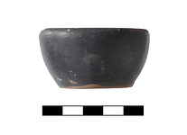 | Description: | Half of a flat-bottomed black glazed salt cellar. Pink wash on the bottom. On the inside the ligature <graphic>, as on vases from Section Α, well by Stoa Pit 3 (see P 5116). Cf. Agora XII, no. 912. | |
