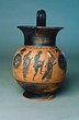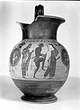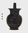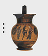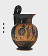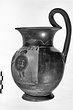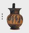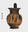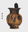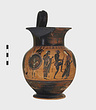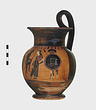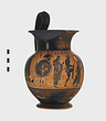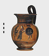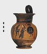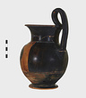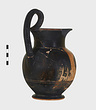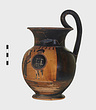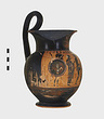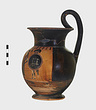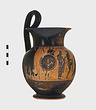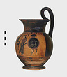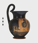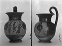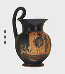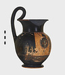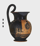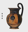 | Description: | Round-bodied oinochoe on convex profiled ring foot; straight neck, flaring at lip; one triple-ridged handle. Fragment missing from lip. Panel on front, opposite handle, arming scene. At center, bearded youth right, putting on greaves; facing him stands a woman dressed in a peplos and holding spear and shield; behind, a white-haired man, draped and holding staff. On either side, facing, two warriors all armed and ready to issue forth. Tongues, alternating black and purple, along top of panel. Purple for hair and beard of arming youth, top of peplos, drapery folds, shield rims, wreaths and one helmet, bands on lip, at base of neck, and below panel. White for woman's flesh, old man's hair, and dots on drapery and helmets; shield designs (one a bent leg, the other a square). Underside of foot reserved; dilute glaze wash over the figured scene. | |