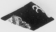 | Description: | From a thin-walled pot; glaze wash inside. Woman's head, filleted, left; at right edge, part of a candelabra(?). Fine contours; brown underpainting on the hair. | |