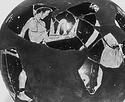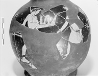 Many more fragments, found in tins, give the full width of the panel decorating the front of the oinochoe, with plain reserved lines bordering it at the sides and an egg pattern above. There are two figures in the scene, the youth who holds a large tray for offerings, and a wreathed, draped male figure facing him. Between them is a low altar; the upper part of the youth is complete; the rest very fragmentary.