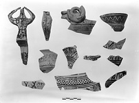 | Description: | Small flat-bottomed cup with low rounded body, high outward-tilted rim. No handles preserved. On body, zigzag with bands above and below; on rim, reserved zigzag, the triangles above and below cross-hatched; on upper edge of lip, series of dots; inside, reserved bands. | |