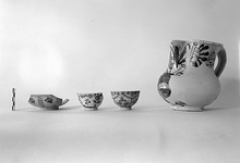 | Description: | Much missing from walls and rim. Restored in plaster. A wide-mouthed pitcher with squat round body. Blue and yellow painted decoration. Below the handle a Turkish(?) inscription painted in black. Soft yellow-buff clay; thick gray glaze. | |