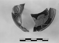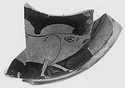 | Description: | Low-type askos with swelling convex top. Flat bottom, very slightly projecting. The back attachment for the horizontal handle preserved on b). On a reserved ground line, a boar, walking right, front part on fragment a), his hind feet on b). Fragment c) is a small piece from the lower part of the body of the pot, with part of the ground line only. Brown inner drawing, for the bristles of the boar's mane, his ribs, and details on his snout. Fine relief contours. Careful work. Inside, brown glaze. The bottom reserved, colored pink. Cf. for the shape contrast later examples: P 1856, P 5330, P 3797. | |