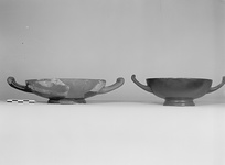 | Description: | One handle broken off; chipped at rim. A handle which may belong but does not join is preserved. Moulded foot decorated underneath with alternating circles of glaze and miltos coloring. Yellowish Attic clay; good but cloudy black glaze, worn inside. | |