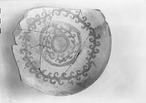 | Description: | About half the rim missing. Flat base, with narrow very low foot ring; the rim, (or sides), less sharply set off from bottom than on P 5632. Fairly good light brown clay; decorated in heavy dark brownish paint over a white slip under colorless glaze. Slip and glaze cover, irregularly, on outside of rim, not below. | |