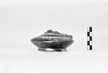 Description:   Handle and neck missing. Flat circular base; vertical ring handle at base of neck. Raised ring, surrounded by incised groove filled with red, around neck. On upper body, wreath in thinned clay paint.