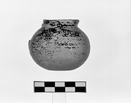 | Description: | Squat jug. Flat-bottomed round bodied jug with short outward-flaring rim. One vertical strap handle, broken off. Buff clay; black glaze, much peeled, inside and out. | |