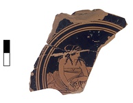 | Description: | Fragment from bottom of stemless cup. Part of central medallion preserved, with partly draped woman reclining left but looking right. Around exterior of medallion part of a tongue pattern, incised beneath the glaze. Relief contours for the profile; brown wash for woman's brassiere. The underside of the cup carefully moulded, with alternating black and reserved bands. The foot broken off. ADDENDA P 20043 (ΣΑ 358) joins, giving top of woman's head, and part of tongue border, also a little of foot, neatly profiled (DVB, May 1950). | |