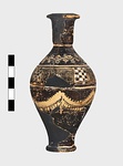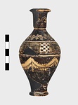 | Description: | Plump fusiform shape; about half of body and all of neck, missing. On shoulder, ivy garland with leaves and berries. Around point of greatest circumference, alternating checkerboard and concentric squares; below, festoons with dots above, pendents below. Black glaze; thinned clay paint with white in checkerboard. Drip of glaze inside. ADDENDA Fragments added Feb. 1950 from Box 216a giving neck and more of shoulder. | |