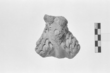 | Description: | In the center of the fragment, a wreathed boukranion, much battered; on either side the start of large garlands. From a brazier? Gritty dark red clay, somewhat micaceous. | |