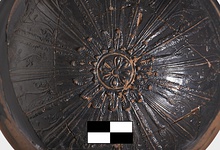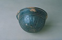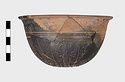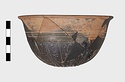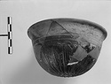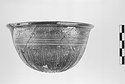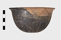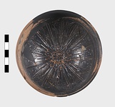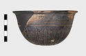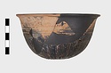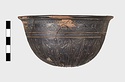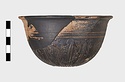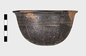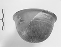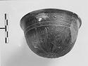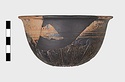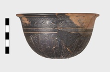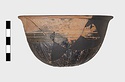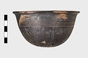 | Description: | Outward turned lip. Rim set off by incised lines, one above, two below, with guilloche between. On rim, below an egg and dart, dolphins leaping above wave pattern. On body, between two alternating kinds of long pointed leaves, acanthus-like sprays terminating in lilies and roses(?). Good black glaze. ADDENDA From metal original; cf. P 11436, P 16221. | |