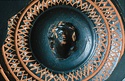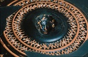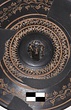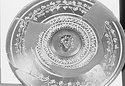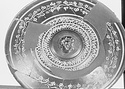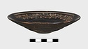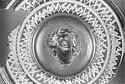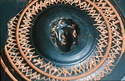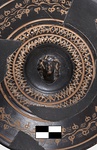 Description:   Mended from several pieces; fragments from rim and wall missing. Plain flaring sides; the bottom slightly depressed to form a small resting surface. Five neat wheel-run grooves around the upper part of the outside; one reserved and colored pink, inside the resting surface. On the inside, first, a circle of ivy leaves, berries and tendrils, in thinned clay; then two rows of double zigzags in thinned clay with white dots at the centers; then, in the middle of the interior, a female head in relief. The interior decoration is set off and separated by wheel-run grooves, reserved.