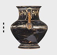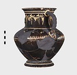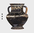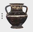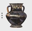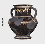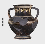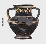 | Description: | Fragments from the lower body and shoulder missing; most of one handle and part of the other. Restored in plaster. High moulded foot with a scraped groove around it. Two scraped grooves below the lip; another at junction of body and shoulder. Twisted handles, with reliefs, women's head, at the lower attachments. On neck, front and back, festoons of grapevine pattern in thinned clay paint. On shoulder, above wave pattern, dolphins, in thinned clay, alternating with white dot rosettes. The waves filled in with white, and purple over the white. Below, two rows of dots, one thinned clay, one white. Black glaze, fairly firm. | |