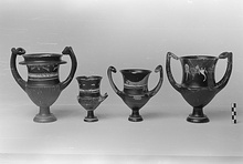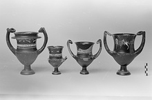 | Description: | Part of one handle and part of the rim missing. On the upper body, dolphins playing over wave pattern. Decoration in thinned clay paint, the waves filled with white. Good black glaze, somewhat peeled. | |