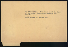 | Description: | Neck and lip broken and mended; about half the lip missing. The shape as P 5863 (ΠΘ 116) but somewhat more slender. Similar decoration: the foot and the lower body glazed, with three reserved lines below the point of greatest circumference. The lip glazed on the top and on the underside. Shoulder, neck and handle reserved. On the shoulder, above three glazed bands, three groups of concentric semi-circles, compass-drawn, separated by two vertical zigzag bands and the handle. Four bands about the base of the neck. Horizontal bands on the handle. Glaze almost all peeled off. ADDENDA P 5863: Round body, flaring ring foot, narrow neck, flaring circular lip; handle from below lip to shoulder. | |
