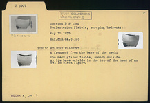 | Description: | A fragment from the base of the neck of a closed vase. The neck glazed inside, smooth outside. At its base outside is the top of the head of an owl in black figure. | |