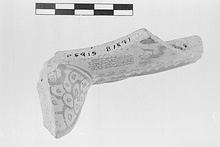 | Description: | Fragment of spouted bowl including part of the rim and spout. The upper wall is gently incurved. On the rim are groups of cross bars. On the wall below the lip a band of pendent triangles and another of hook spirals below it. On the wall, the heads of two bearded men to the right (one on the spout) rendered in outline. In the field, a massive filling ornament made up of zigzag lines; on the spout a scale pattern. The inside is glazed. Glaze inside and out has fired a brownish red. | |
