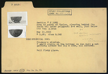 | Description: | Fragments missing. A small circle on the bottom; on the wall a net pattern; around the lip a line, all incised. Dull flaky glaze. | |