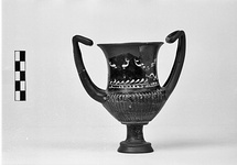 | Description: | The height preserved from the rim to the start of the base; the walls fragmentary; one handle entirely missing and part of the other. Lower body ribbed. Upper body, from bottom, has white dots between two yellow lines; diagonal yellow petals; wavy white line; yellow dolphins alternating with white dot rosettes. | |