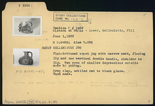 | Description: | Handmade. Flat-bottomed squat jug with narrow neck, flaring lip and one vertical double handle, shoulder to lip. Two rows of shallow depressions outside made by poking. Gray clay, mottled red to black glaze. | |