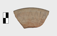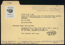 Description:   Fragment from a clay disk object with a hole in the middle. For shape cf. MC 115.