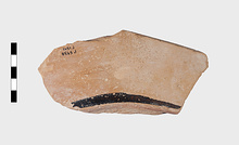 Description:   From a large open bowl (possibly a semi-glazed krater?). Black glaze inside; none, except a band around the foot, outside.