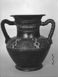 Elaborate ornamentation. Shoulder pattern as in Pfuhl (1923), fig. 753. Festoon on neck; Satyr heads at base of handles. Ring base unglazed on resting surface and in groove around outside.