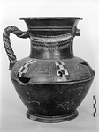 Description:   Mended from many fragments; one handle, and parts of rim, neck and body, missing; restored in plaster. Ring base; long neck, flaring at rim; twisted rising handles.