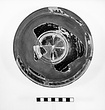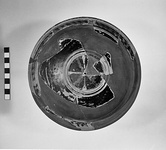 Description:   None of the lip preserved. Restored in plaster. Somewhat similar in shape to P 6010 (Γ 1611). On flat bottom double cross of thinned clay paint and wavy white; two grooves. On body, horizontal leaves with long white and thinned clay paint petals, linked by festoons of white dots. A groove around the outer edge of the flange, and two grooves around the lower part of the inward-sloping rim. On the flange, a row of white blobs. On rim, thinned clay paint blobs dotted with white, alternating with triple white strokes.