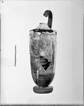 Description:   Broken off at neck; several body fragments missing. The front burned and badly faded. A stele, decorated with fillets, between two standing draped figures, the one to left with red hair, the other in a brown cloak. Matte paint.