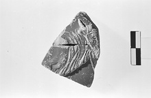 | Description: | Fragment from side wall of a bowl; broken all around. The forepart of a bull being led by a halter, right. Fine fabric and relief. Western Sigillata Ware. | |
