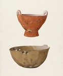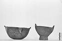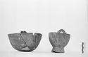 | Description: | Upper parts of handles and fragments from side wall missing; restored in plaster. High base ring; deep bowl; two vertical loop handles rising above rim, their attachments running well down the side wall. Handmade and crude. Coarse gritty clay, fired black inside, dull orange on surface. Rudely burnished both inside and out. Sub-Neolithic or Middle Helladic? | |