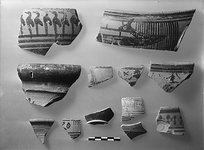 | Description: | Joins with P 2400. Fragment from upper wall. Lip slighlty undercut on outside. On upper wall, along boat of which only the stern remains, turned back and ending in an animal's head. The stern is crossed by a group of vertical bars which adjoins the handle. On top of the lip are groups of transverse bars. Reddish-brown glaze, much flaked inside. | |