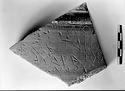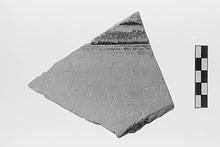 | Description: | From a large open bowl. Incised outside: <graphic> Black glaze on rim only. | |