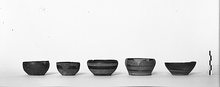 | Description: | Chips missing from the rim. Low flat base; slightly incurving rim. Inside, glazed black; on outside, black and reserved bands. Good glaze and fab ric. | |