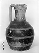 | Description: | Part of lip missing. Trefoil mouth; flat vertical handle. Ring foot. Three triple reserved bands around body. On front of neck, reserved panel with zigzag decoration. Horizontal stripes on handle. Black glaze, somewhat peeled on neck. | |