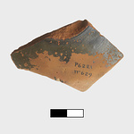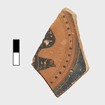 | Description: | Fragment from center of a kylix, preserving a bit of the central medallion. A bird flying to right; around the medallion a band of black dots and a narrow band of purple. Deep buffy-pink clay. | |